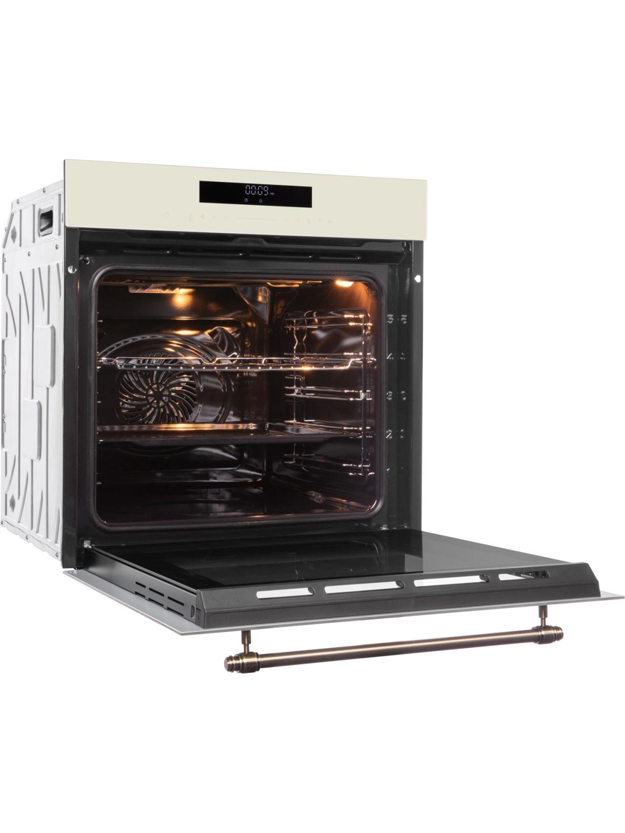 Модель шириной 59,5 см выполнена в классическом стиле. Стеклянный фасад бежевого цвета добавляет технике изысканности. Дверца духового шкафа оснащена тройным съемным стеклом. Это позволяет легко разобрать дверцу и тщательно очищать каждое стекло по отдельности. Внутреннее покрытие духового шкафа — эмаль легкой очистки. Она защищает внутреннюю часть духовки от коррозии металла, отталкивает жир и влагу, что способствует максимальному упрощению процесса уборки камеры. Лампа подсветки мощностью 25 Вт обеспечит хорошую видимость в процессе готовки, а вентилятор охлаждения предотвратит перегрев устройства.