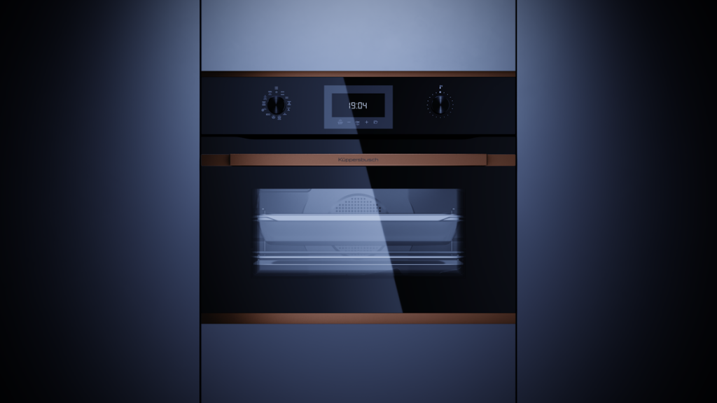 Управление. Электронная система с поворотными алюминиевыми переключателями и TFT-дисплеем с графическими полями. На дисплее отображается фактическая и рекомендуемая температура, а также время до окончания приготовления.
