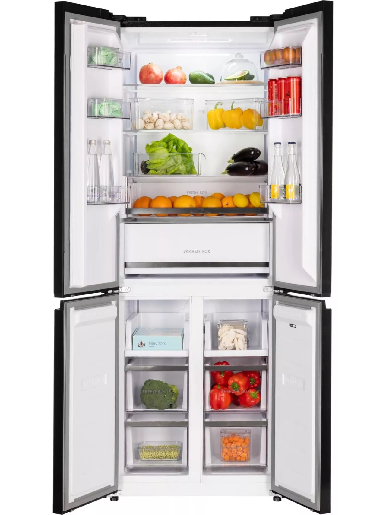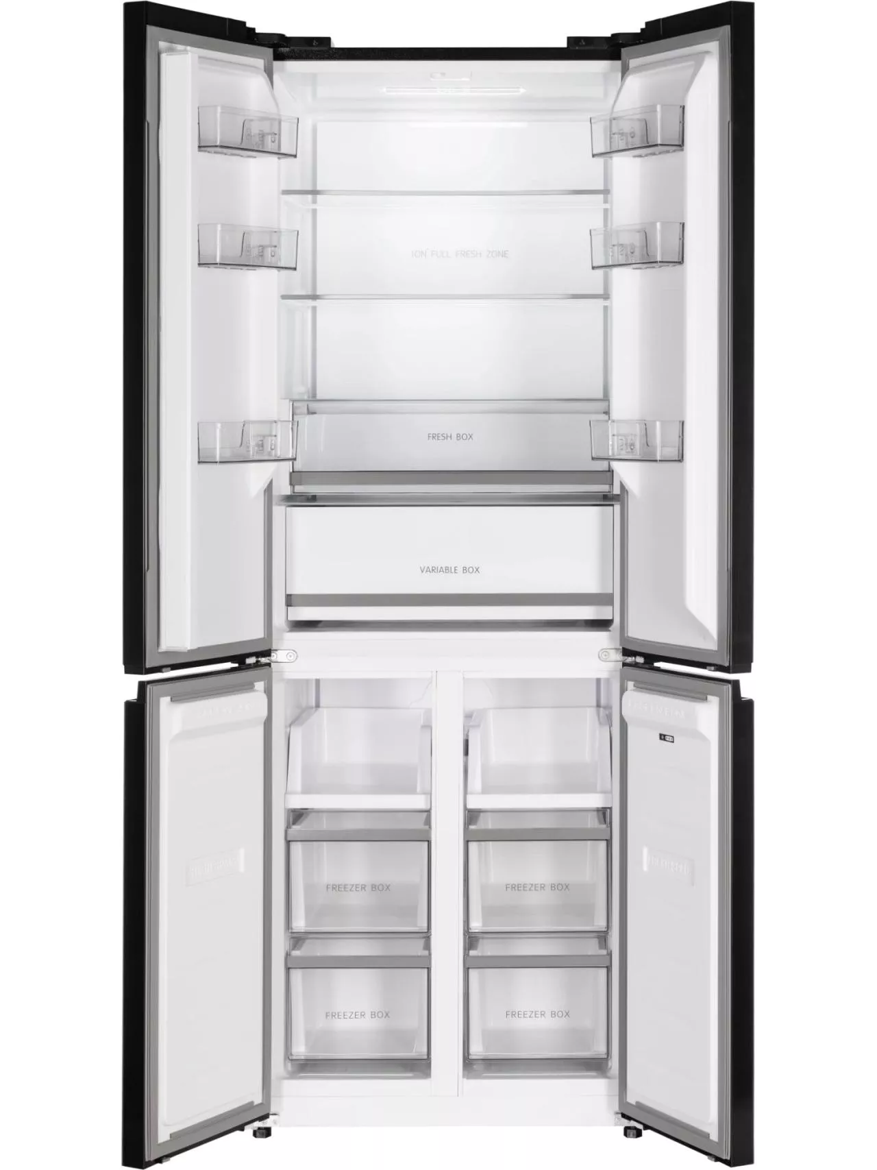 Четырехдверный холодильник NORDFROST RFQ 440 NFGB с инверторным компрессором, автоматической системой охлаждения No Frost и электронным управлением — отличное решение для большой семьи. Модель сочетает в себе утонченный дизайн и функциональность. Прибор, выполненный в стильном черном цвете, имеет высоту 192 см и ширину 703 мм. Общий объем 417 литров дает возможность хранить большое количество продуктов.