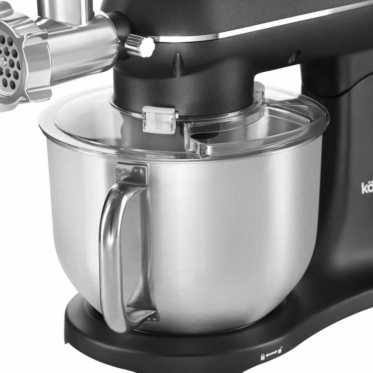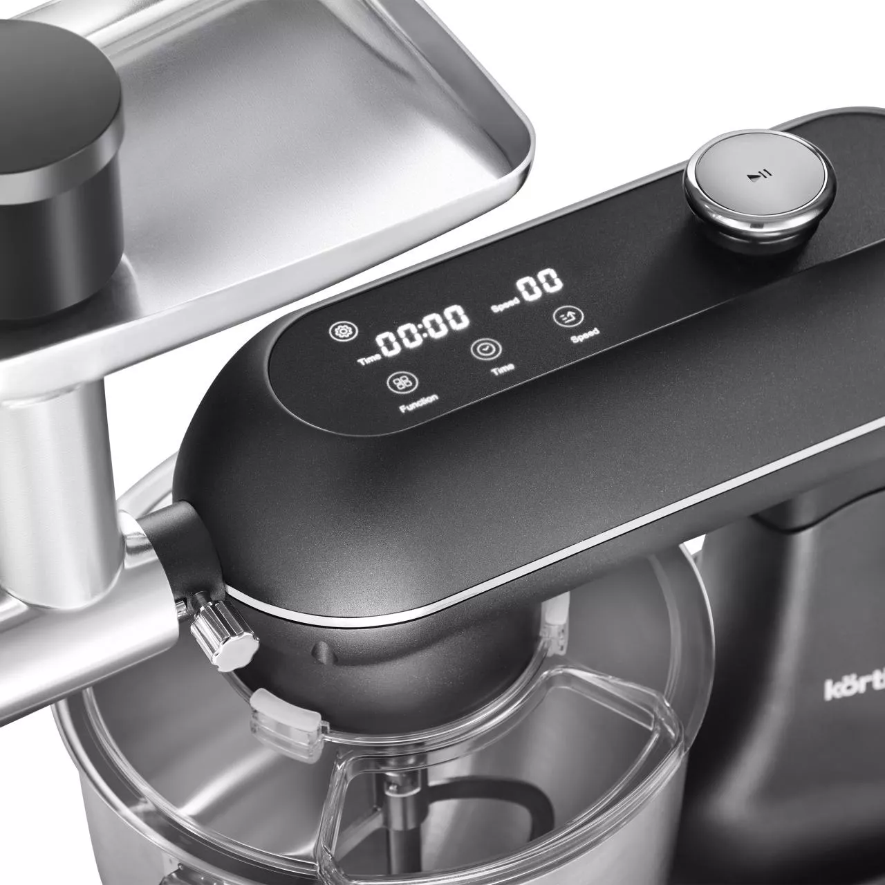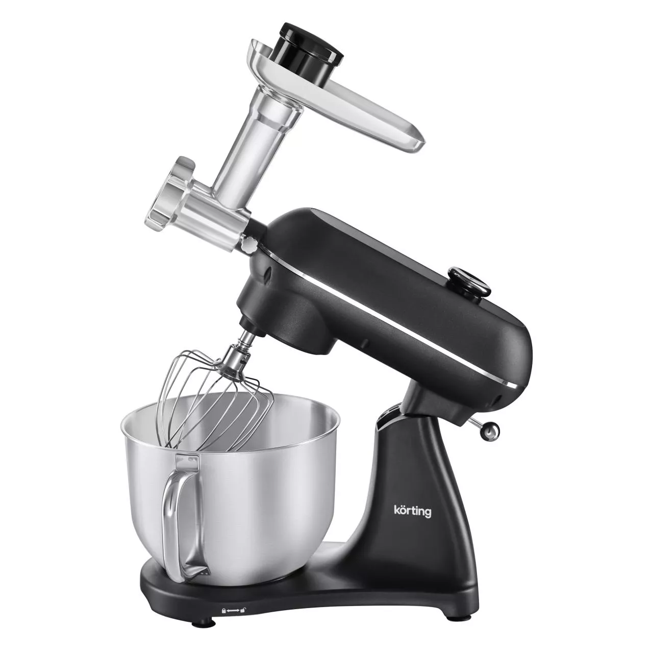 Кухонная машина KORTING KKM 0107 MB N представляет собой многофункциональное устройство. Выполненная в строгом черном цвете, она станет не только надежным помощником на кухне, но и стильным акцентом в интерьере. Оснащенная современным цифровым дисплеем, машина показывает текущую скорость работы и время, что делает ее эксплуатацию более удобной. В набор входят пять различных насадок, которые позволяют выполнять разнообразные кулинарные задачи, а одиннадцать скоростных режимов помогут идеально настроить работу в каждом конкретном случае. Процесс смешивания, взбивания и замешивания теста происходит в большой чаше из нержавеющей стали объемом 6,5 л. Благодаря планетарному вращению насадок достигается высокоэффективное перемешивание всех ингредиентов. В комплекте с мясорубкой идут два диска из нержавеющей стали (5 и 7 мм), которые упростят приготовление фарша, кеббе или колбасы. Интуитивно понятное управление кухонной машины Кертинг делает настройку скорости и выбор необходимых режимов простым и удобным. Двойная защита двигателя обеспечивает предотвращение от перегрева и перегрузки, а прорезиненные нескользящие ножки гарантируют устойчивость на любых поверхностях.