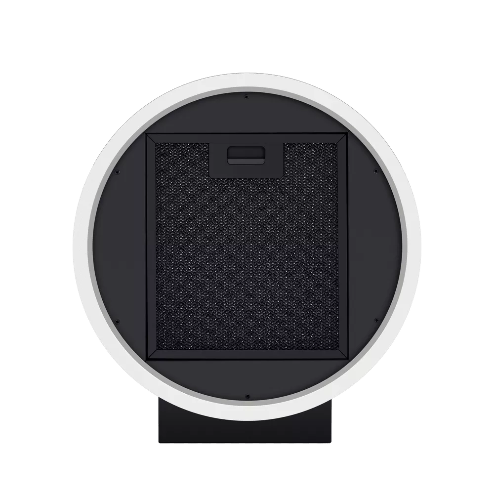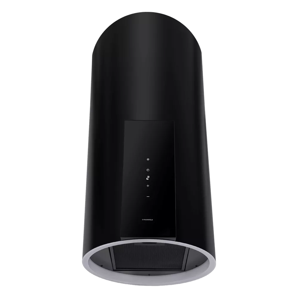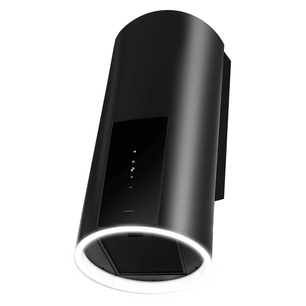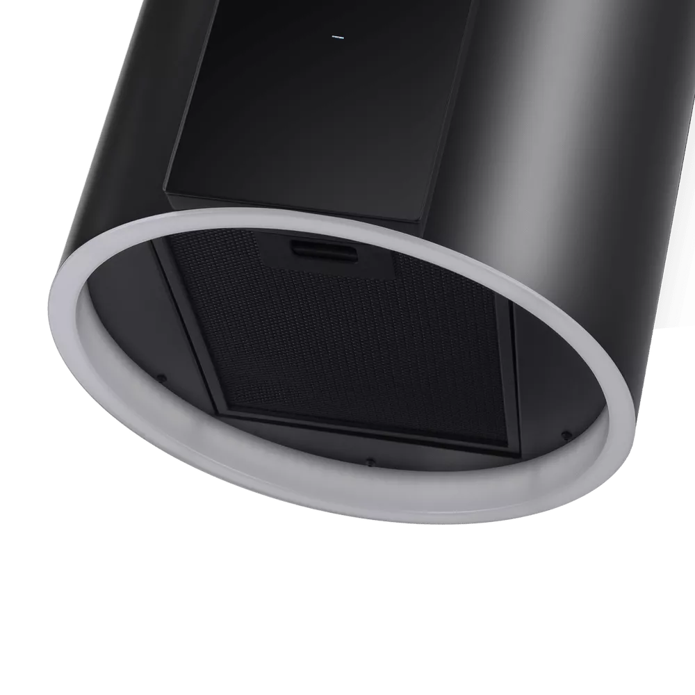 Корпус цилиндрической формы, выполненный из нержавеющей стали с термостойким покрытием, устанавливается на стену над поверхностью плиты. Алюминиевый многослойный жироулавливающий фильтр находится в нижнем торце вытяжки.