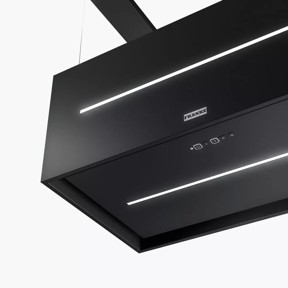 Островная кухонная вытяжка Franke FMAS BK EXTRA MATT F80 KL — выбор для тех, кто ценит чистый воздух и аккуратный дизайн. Черный матовый корпус органично вписывается в современные кухни и не отвлекает от общего интерьера, а фоновая подсветка из LED-лент по бокам создает уютную атмосферу и подчеркивает зону готовки.