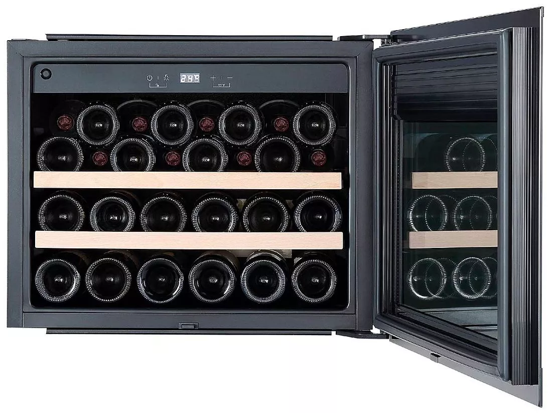 Внутреннее LED-освещение подчеркивает внешний вид бутылок и делает процесс выбора вина удобным и простым. Кроме того, шкаф оснащен функцией сенсорного управления, которое позволяет легко и быстро настроить нужную температуру. Диапазон температур от +5 до +20 градусов Цельсия обеспечивает идеальные условия для хранения различных видов вина. Вместимость шкафа составляет 28 бутылок, что позволяет хранить великолепную коллекцию вин. Две деревянных полок обеспечивают удобное размещение бутылок.